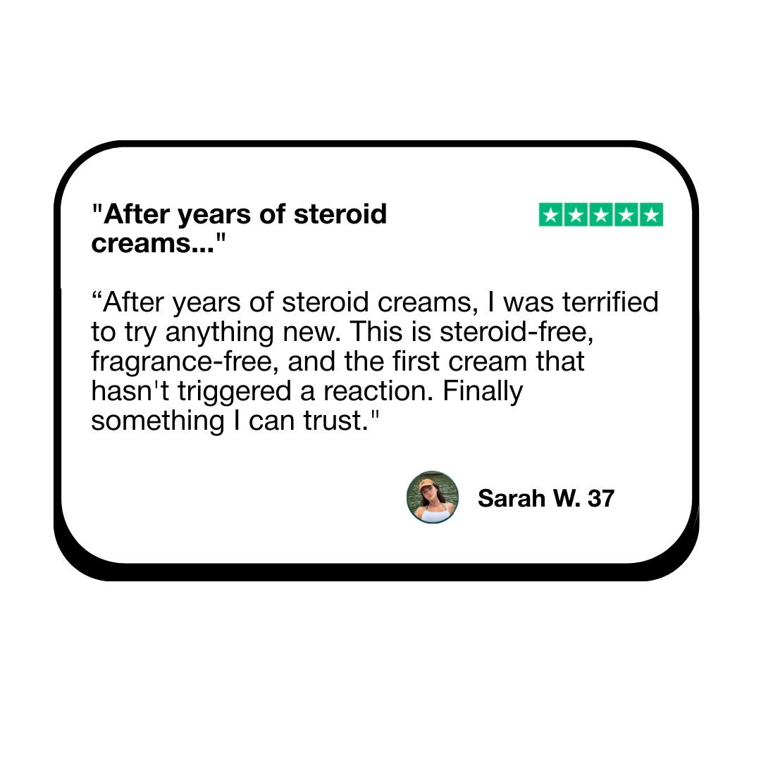 "After years of steroid creams, I was terrified to try anything new. This is steroid-free, fragrance-free, and the first cream that hasn't triggered a reaction." Sarah W. ✓ Verified